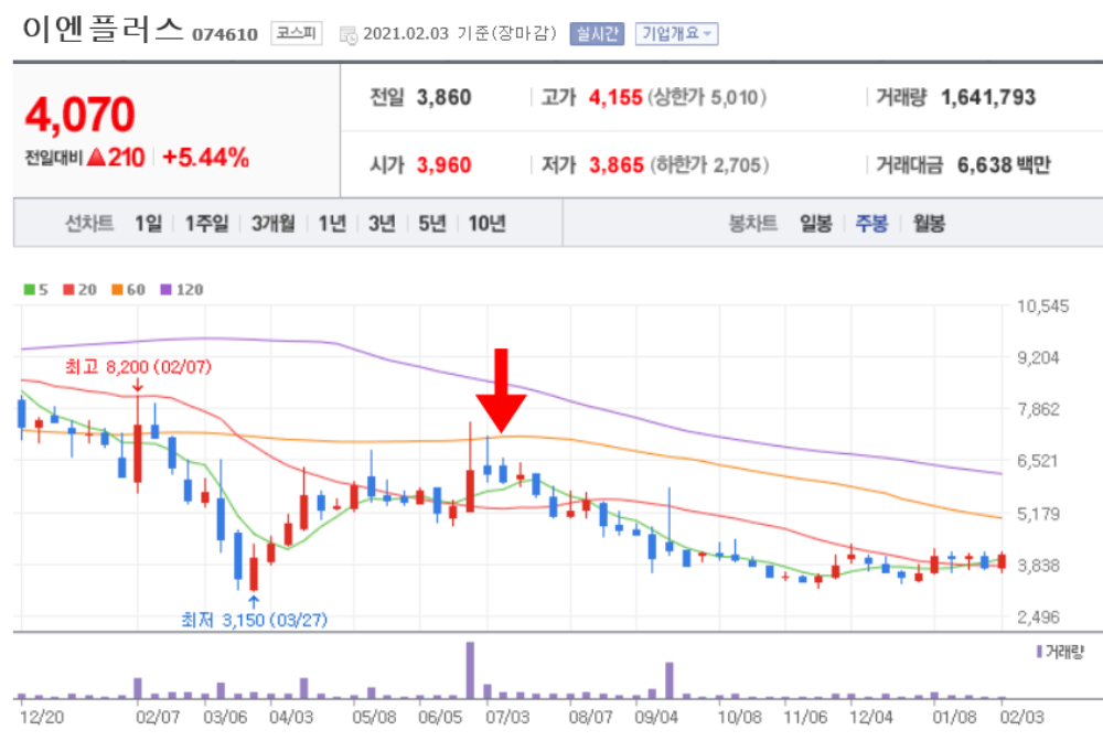 장동민이 동료의 말만 듣고 투자한 종목은 '이엔플러스'입니다. 소방기구 제조 납품 회사로 알려진 이곳은 지난해 2차전지 관련주로 분류되어 급상승한 종목인데요. 장동민이 매수한 시점부터 얼마 가지 않아 반 토막이 났습니다. 적지 않은 투자금을 잃었지만 대신 장동민은 주식투자에 대한 승부욕과 불씨를 얻었습니다.