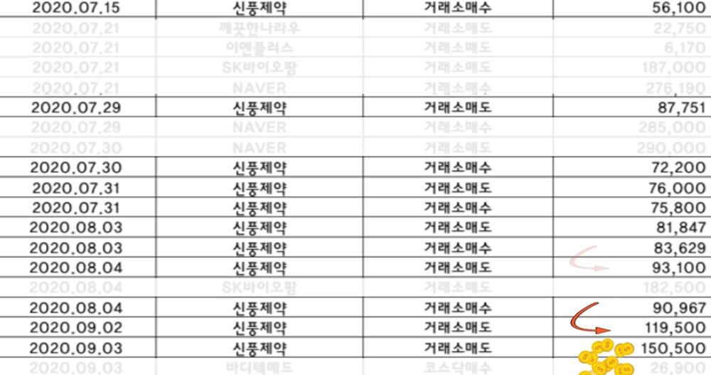 신풍제약 역시 최초 56,100원일 때 매수해서 10% 내외의 수익이 날 때마다 매도하고 조정장에 다시 매수하기를 반복해서 150,500원이 될 때까지 꾸준히 수익을 냈습니다.