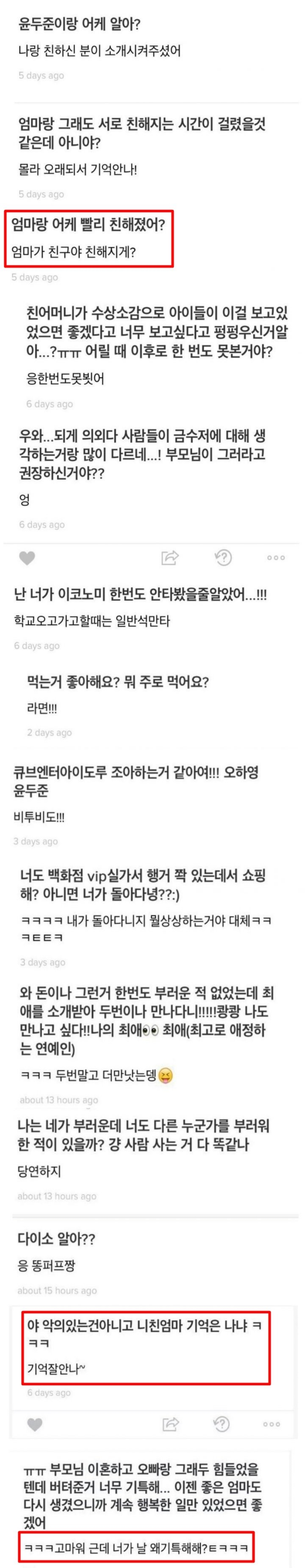 또 친어머니에 대한 질문에 "기억 잘 안 나. 한 번도 못 뵈었어"라면서도 친어머니와 꼭 닮았다는 말에는 "그런 말 하는 거 아니야. 그분이 얼마나 이쁘신데"라고 애정을 드러냈고, 새엄마랑 어떻게 친해졌냐는 질문에는 "엄마가 친구냐 친해지게"라며 쿨한 대응을 했지요.