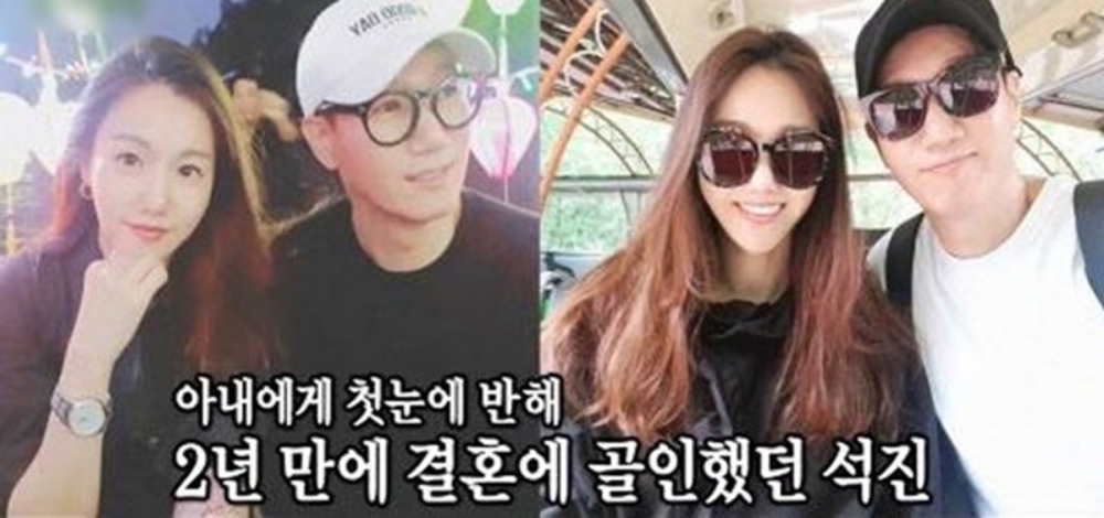 지석진은 "단 5분씩이라도 100일 동안 매일 만나보자"라고 제안했고 수정 씨는 100일의 시간 동안 지석진의 매력에 반했습니다. 이후에는 두 사람의 연애를 알게 된 정선희, 홍진경 등이 극구 만류했음에도 불구하고 "언니, 그 사람 진국이더라"라며 확신에 차서 지석진에게 먼저 결혼을 제안했습니다. 덕분에 1999년 지석진은 8살 연하인 26살 아내와 결혼에 골인했습니다.
