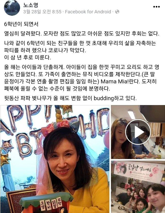 코로나로 인해 친구들과 모임을 미뤘다는 노 관장은 "올해는 아이들과 단출하게. 아이들이 집을 한껏 꾸미고 요리도 하고 영상도 만들었다. 또 가족이 출연하는 뮤직비디오를 제작한단다. 도저히 페북에 올릴 수 없는 수준이 될 것임에 분명하다"라고 자랑 섞인 메시지를 남겼습니다.