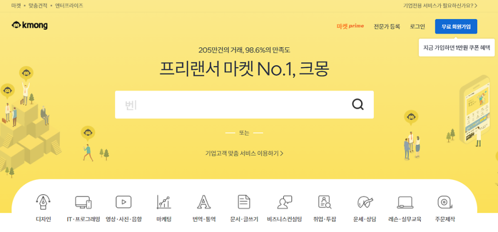 애초에 비즈니스용으로 설계한 것이 아니다 보니 실질적인 거래 시스템에 부족한 부분이 많았음에도 불구하고 '크몽'은 수요자들의 요구에 따라 자연스럽게 성장했습니다. 2012년 초반에는 5000원을 받고 모닝콜을 해주거나 상사 욕 대신 들어주기 같은 '누군가의 사소한 재능을 5000원에 산다'는 재능마켓으로 입소문을 모았는데요. 현재는 전문가와 연결하는 전문 프리랜서 마켓 플랫폼으로 발전해서 디자인, 영상제작, 법률, 회계, 인사 등 각종 사내 업무를 지원하는 전문가와 연결하는 수준까지 확장되었습니다.