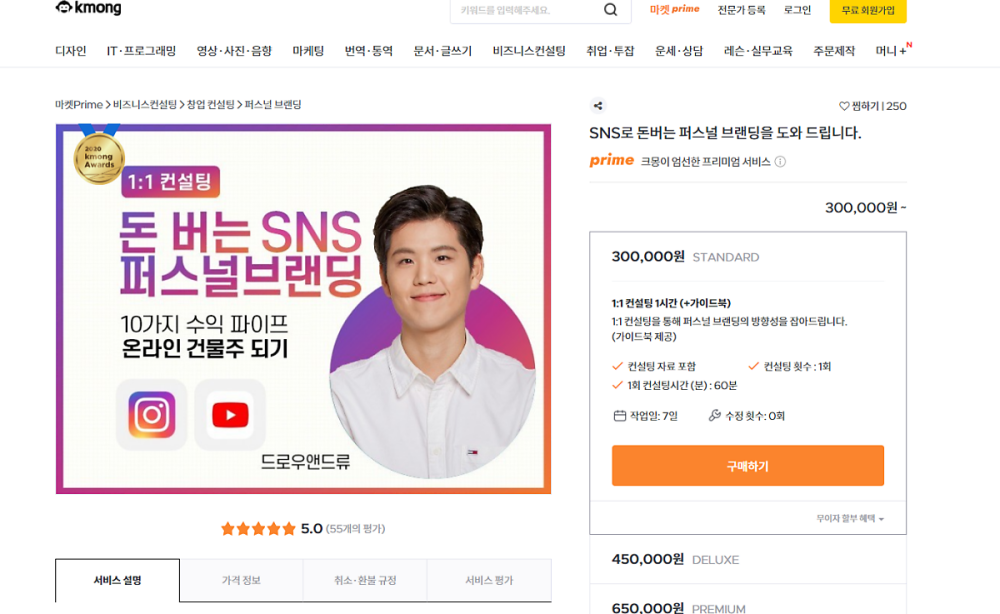 또 퍼스널브랜딩에 대해 1대1로 컨설팅해 주는 프로그램의 경우 1시간에 30만~45만 원까지 가격이 책정되어 있는데요. 드로우앤드류 외에도 크몽을 통해 자신의 재능을 판매 중인 프리랜서들은 '안구건조를 이겨냈던 나만의 노하우(13000원)', '중고차 구매분석 및 동행(55000원)', '사랑꾼 연애 상담소(30000원)' 등 다양한 콘텐츠로 수입을 만들어내고 있습니다.
