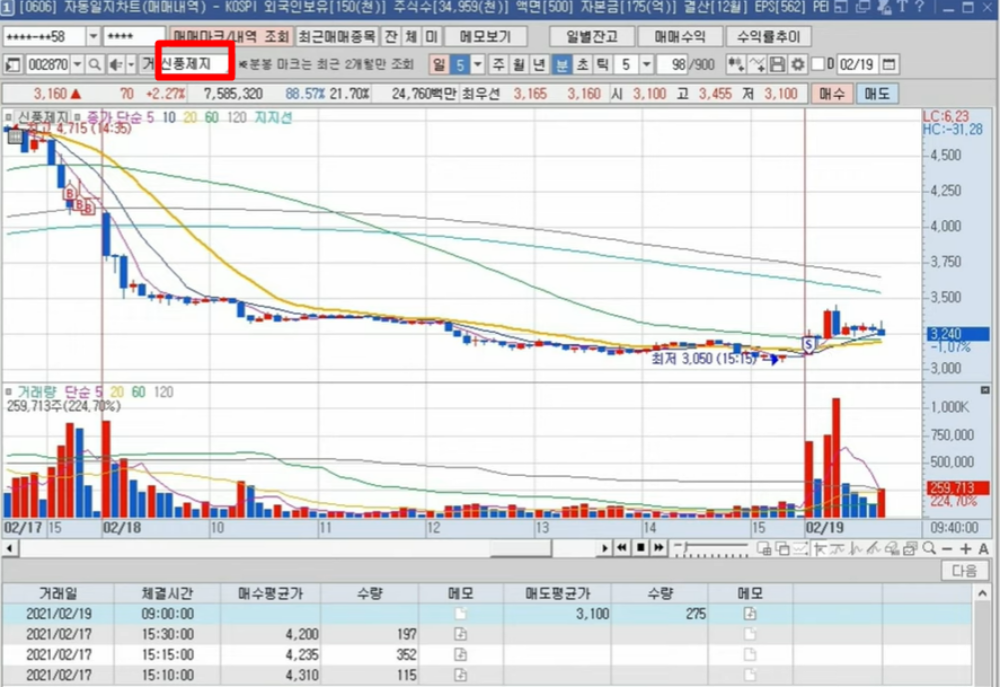 하지만 2월 배 씨의 투자일지는 우울합니다. 종가에 매매한 신풍제지가 다음날 아침 장 시작하자마자 10%이상 급락하면서 아무런 대응을 하지 못했고 '손절해야 하나 기다려야 하나'를 고민하는 사이에 28%까지 추락했습니다. 그날 밤 잠도 자지 못하고 '내일 아침에 팔아야 하나'를 고민한 배 씨는 다음 날 아침 '에라이 모르겠다'라는 마음으로 시초에 매도 버튼을 눌렀는데요. 배 씨가 팔자마자 해당 종목은 10% 이상 회복하며 한 번 더 상처를 주었지요.