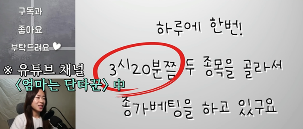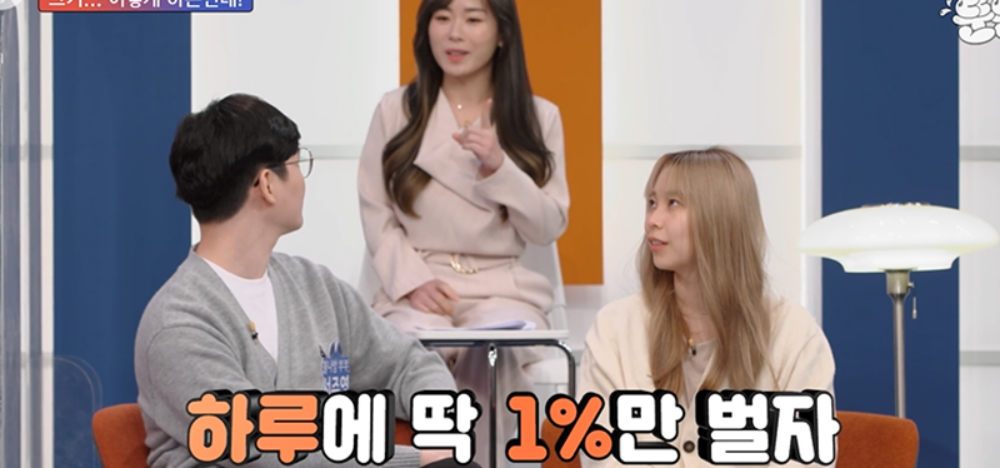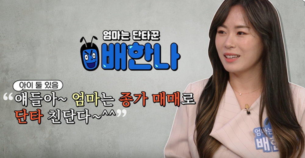 이에 대해 배한나 씨는 "목표가 거창하지 않다. '하루에 딱 1%만 벌자'는 생각이다"라고 말했습니다. 1% 수익률을 목표로 한다는 말에 대부분의 패널들은 "그럴 바에는 한 군데 쭉 놔두는 게 낫지 않느냐"라며 답답해했고 배 씨는 "치고 빠지고 하는 게 못 보겠더라. 빠질 때 못 참겠고"라며 단타를 선택한 이유를 설명했지요.