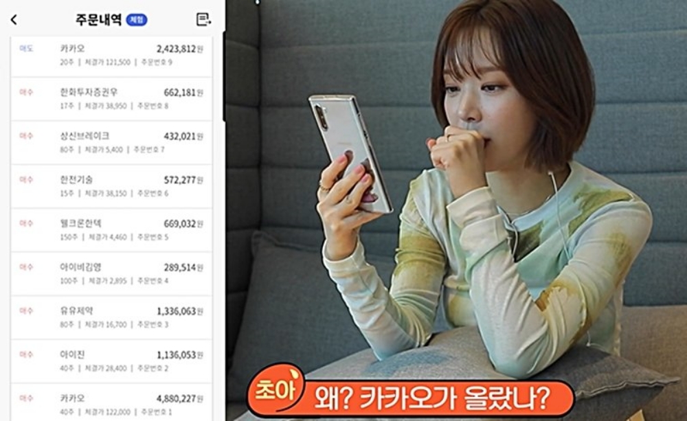 이사하면서 들어간 보증금 정도를 제외하고는 지난 5년의 연예계 활동 동안 번 돈을 모두 주식투자에 쏟아부었다는 초아는 현재까지 55% 수익률을 기록 중이라고 밝혔습니다. 수익을 금액으로 말하자면 "몇천 단위"라고.