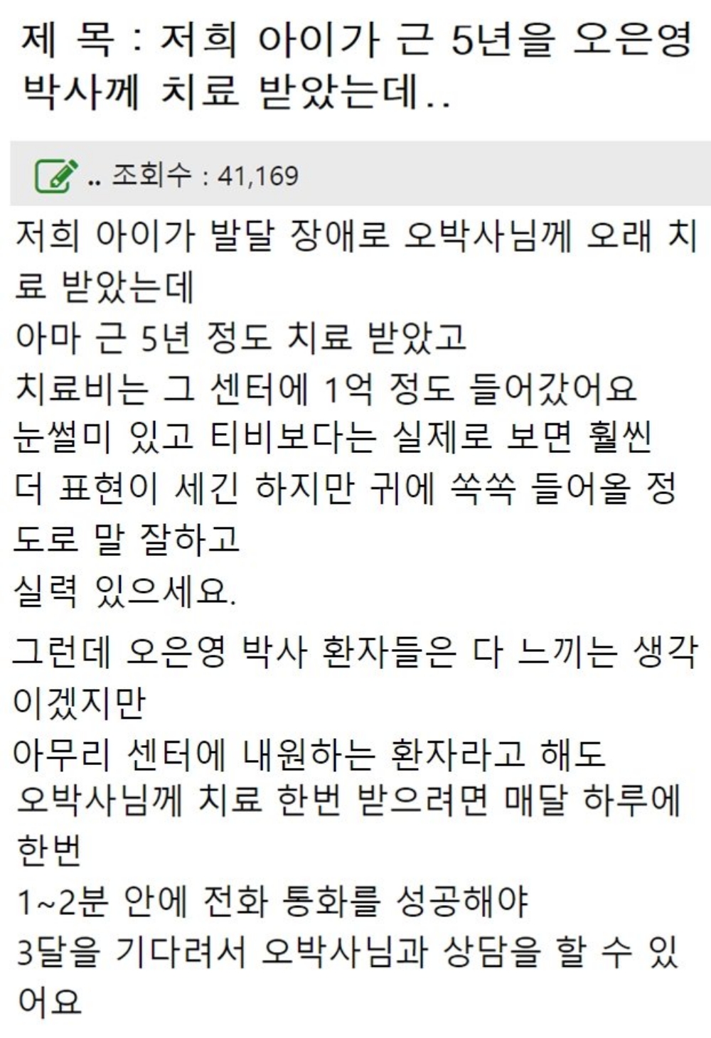 해당 방송의 출연자들은 절실함이 통한 덕분에 사연에 채택되어 오은영 박사의 솔루션을 직접 받았지만 방송기회가 아닌 현실에서 오은영 박사의 진료를 받기란 하늘의 별따기입니다. 실제로 온라인상에는 오 박사의 병원에 다녀온 후기가 큰 화제인데요. 전국 각지에서 진료를 원하다 보니 전화예약을 위해 600통이나 걸었지만 실패했다는 경우나 몇 백통을 걸어서 겨우 통화가 되었지만 당장 진료예약이 꽉 차서 몇 달을 기다려야 한다는 경우가 비일비재합니다.