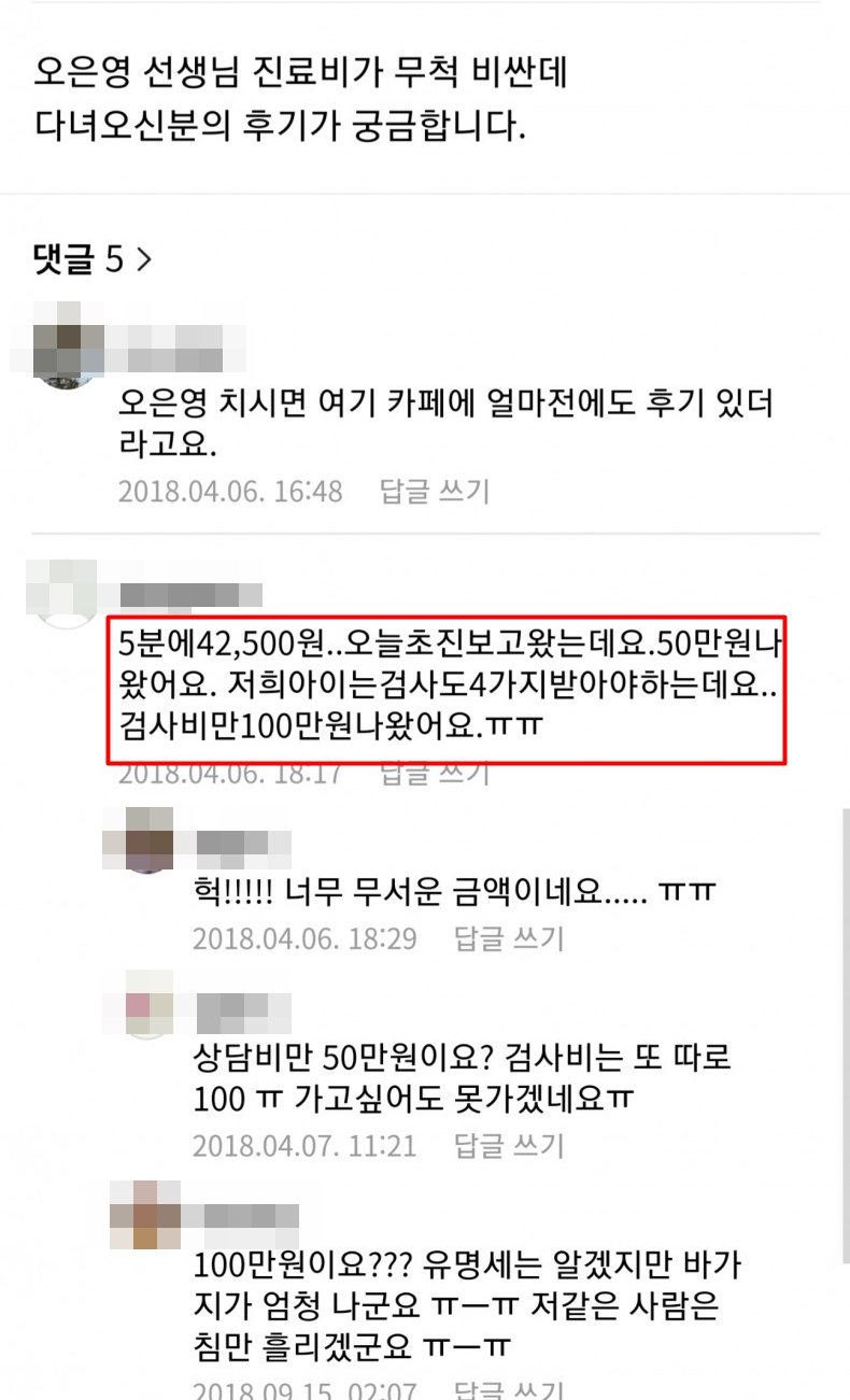 또 어렵게 진료예약을 잡고 상담을 받더라도 "5분에 42,500원이라 초진을 보고 나니 상담비만 50만 원이 나왔다"면서 그 외 검사비도 100만 원이라는 후기가 눈길을 끕니다. 실제로 오 박사가 운영하는 병원의 홈페이지에 공개된 진료비용을 보면 '정신요법'으로 표기된 상담비용이 30분에 최소 105.000원부터이고 검사비는 15만 원부터 시작됩니다.